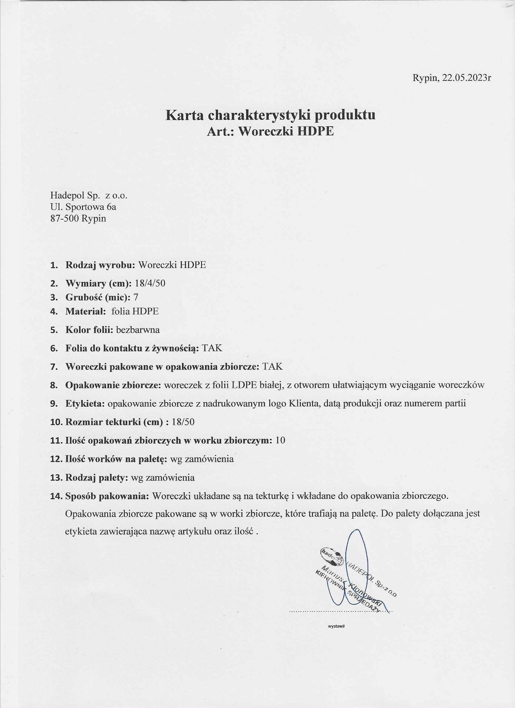- wykonane z przezroczystej folii HDPE przeznaczonej do kontaktu z żywnością