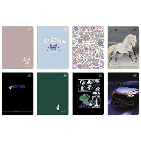 Format: A5. Liczba kartek: 16. Zaokrąglone rogi. Okładka pokryta lakierem UV. Ściąga z podstaw ortografii na odwrocie zeszytu.