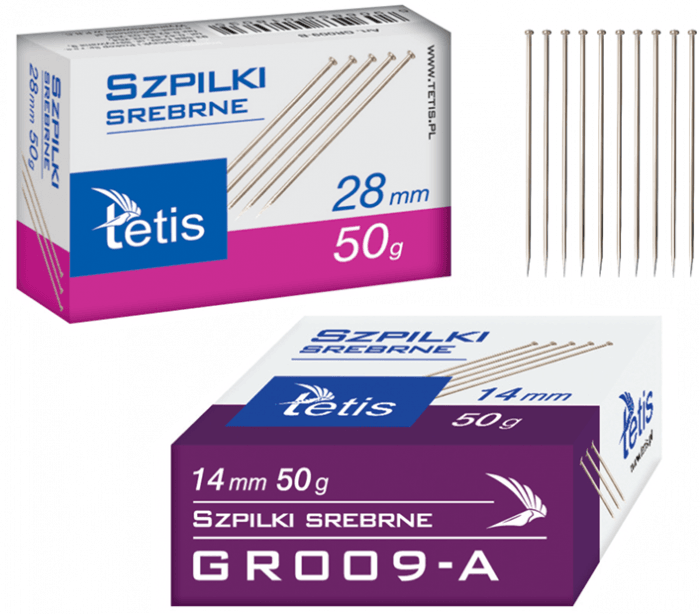 Szpilki stalowe, posiadają metalowe główki. Opakowanie: pudełko 50 g / 10 pudełek po 50 g