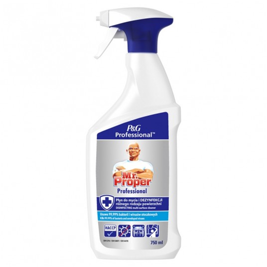 Profesjonalny dezynfekujący płyn do mycia powierzchni Mr Proper Professional to gotowy do użytku spray do jednoczesnego mycia i dezynfekcji (zgodnie z normami EN1276 i EN13697) powierzchni wewnętrznych, w tym szklanych. Obszary zastosowania: większość powierzchni wewnętrznych takich jak - stoły, biurka, krzesła, inox, telefony, klamki oraz powierzchnie szklane takie jak - okna, lustra, blaty stołowe, ekrany itp.
