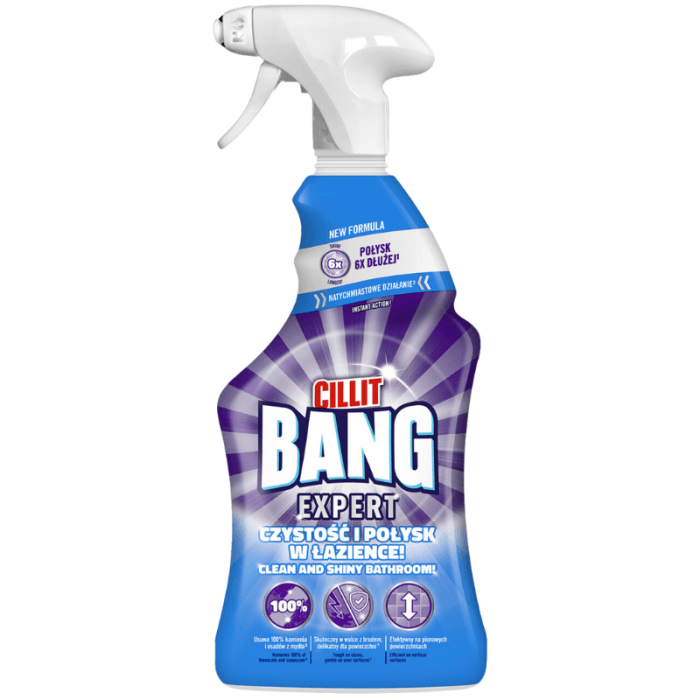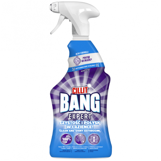 Nowy Cillit Bang do Łazienek jest niezawodny w usuwaniu brudu i zapewnia doskonały połysk. Dodatkowo zapewnia ochronę przed ponownym osadzaniem się brudu. Substancja powierzchniowo czynna usuwa kamień zapewnia długotrwały połysk. Jego formuła efektywnie działa w celu usunięcia 100% kamienia oraz osadów z mydła i brudu. Dzięki temu Twoja łazienka pozostanie czysta i lśniąca nawet do 4 razy dłużej!