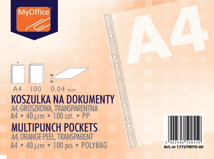 Opis:- transparentne- wzmocniony brzeg- rozcięte na górze- do zastosowania dla dokumentów w formacie A4- grubość: 40 mic.- ilość dziurek do wpięcia: 11