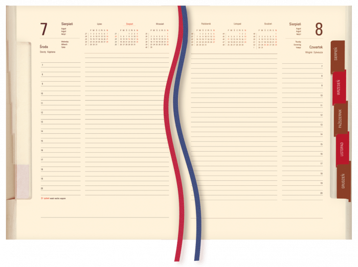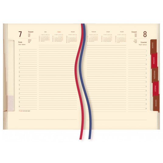oprawa - skóropodobne, wycięty register dwuprzebiegowy, dwie tasiemki, perforowane narożniki.