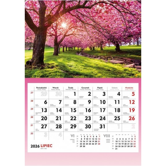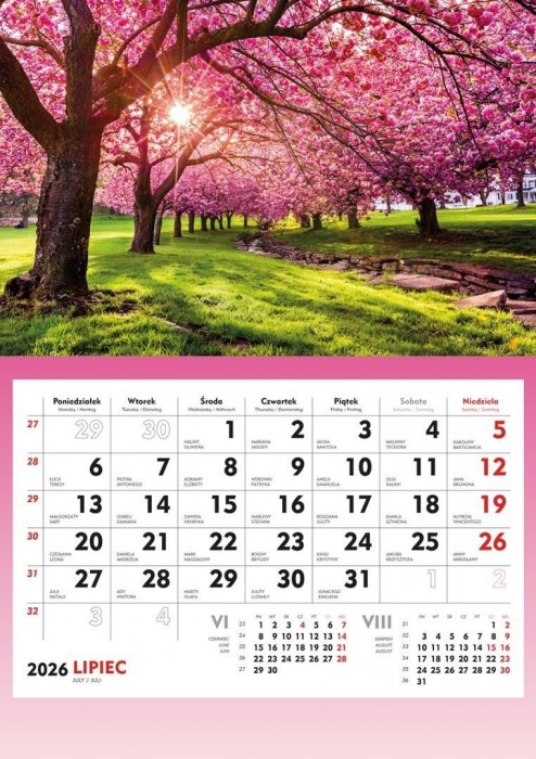 Główka pełnokolorowa, okienko przesuwane, nazwy miesięcy i tygodni w wersjach językowych, miejsce na nadruk reklamowy.