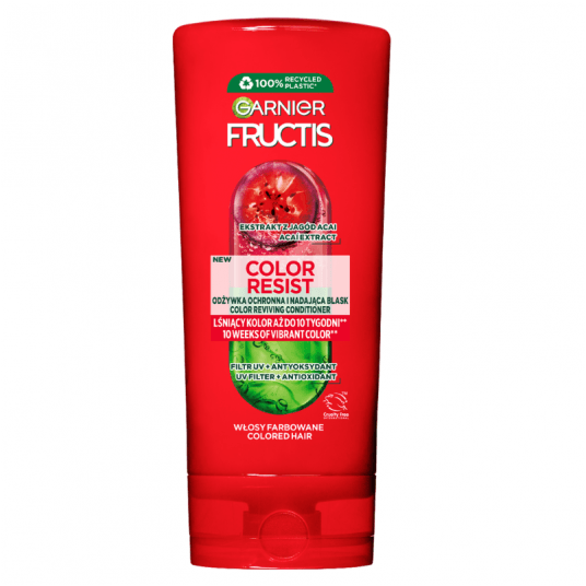 Nowe formuły Garnier Fructis bez parabenów zawierają wzmacniające ekstakty owocowe. Garnier stworzył wyjątkowe połączenie białek z cytryny, witamin B3 i B6, ekstraktów z owoców i roślin o udowodnionej skuteczności, aby zaoferować Ci widocznie zdrowsze, mocniejsze włosy. Formuła odżywki wzmacniającej Color Resist zawiera ekstakt z jagód acai i polifenole, aby odżywić i chronić włosy farbowane. Włosy farbowane są odżywione, miękkie i pełne blasku.