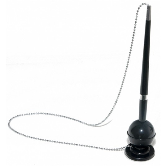 długopis na metalowym łańcuszku dedykowany punktom publicznym, takim jak: urzędy, punkty pocztowe, recepcje i sekretariaty, etc. kulka z węglika wolframu długopis utrzymywany w pozycji pionowej obrotowa kulka elegancki design stabilna podstawa przyklejana do powierzchni biurka długość łańcuszka: 58 cm grubość końcówki: 0,7 mm długość linii pisania: 900 m kolor obudowy czarny, wkład niebieski Nazwa producenta: